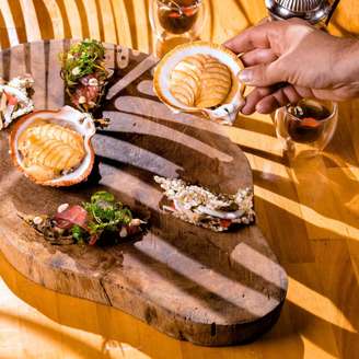 A tábua do pescador que provei tinha caranguejo com butarga; mexilhões e vôngoles com coco fresco; ostras de mangue; croquetes de camarão; robata de polvo; atum com molho nikkei de hibisco; ceviche de robalo com leite de tigre de acerola; a cauda de lagosta vem no papel-manteiga, com molho béarnaise de ostras… e ainda chegam minibúrgueres em que os minibrioches feitos na casa e tostadinhos são recheados com uma maionese de camarão e curcuma. Tudo saboroso, com pontos perfeitos de cocção.