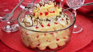 - Em um refratário médio, faça camadas de biscoito umedecido com leite e rum e de creme de chocolate branco.