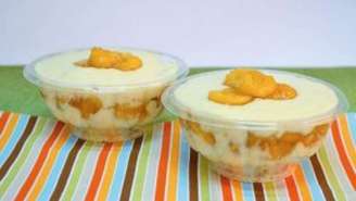- Em potes transparentes individuais, faça uma camada de bolo esfarelado, uma de doce de banana e uma de creme, repetindo as camadas até acabarem os ingredientes, terminando em creme e decorando com doce de banana no centro.