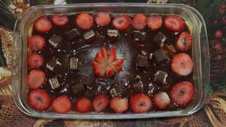 - Despeje o creme em uma travessa ou refratário médio, espalhe chocolate granulado, decore com os morangos inteiros e leve à geladeira por 3 horas antes de servir.