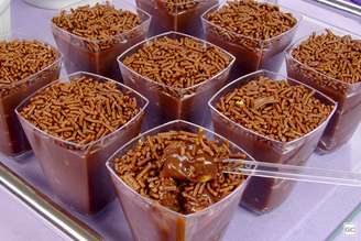 - Encha os copinhos com o creme e polvilhe com granulado. Leve à geladeira por 2 horas e sirva