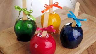 A maçã do amor colorida é um doce rápido e prático de fazer, além de deixar a decoração das festas de Halloween muito mais bonita.