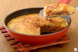 - Espalhe o recheio, preservando 2cm da borda. Cubra com a batata restante, apertando levemente. Tampe e frite por 5 minutos em fogo baixo. Vire sobre um prato, volte novamente para a frigideira e volte ao fogo baixo até dourar do outro lado. Desligue e sirva