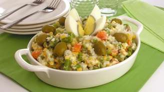 - Despeje no purê, acrescente a ervilha, o milho, a azeitona e a maionese reservada