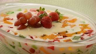 - Retire as gelatinas da geladeira, corte em cubos, coloque em um refratário grande, junte o creme e misture delicadamente.