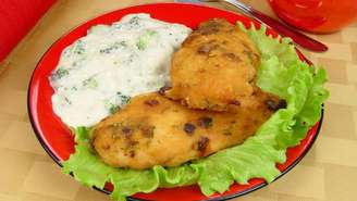 - Passe o peito de frango na maionese e em seguida no pó para sopa de cebola.
