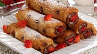 - Divida o creme de avelã e o morango entre elas e enrole, formando rolinhos, apertando bem.