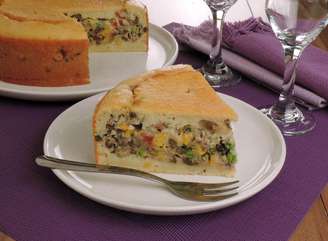 - Para o recheio, em uma vasilha, misture o atum, a ervilha, o milho, a cebola, o tomate e a azeitona.