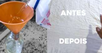 Caso necessite desamassar alguma peça sintética, recomendamos que faça uma solução usando amaciante e água, como na imagem abaixo. E para secar mais rápido, adivinhe? Adicione álcool (na mesma proporção de água).