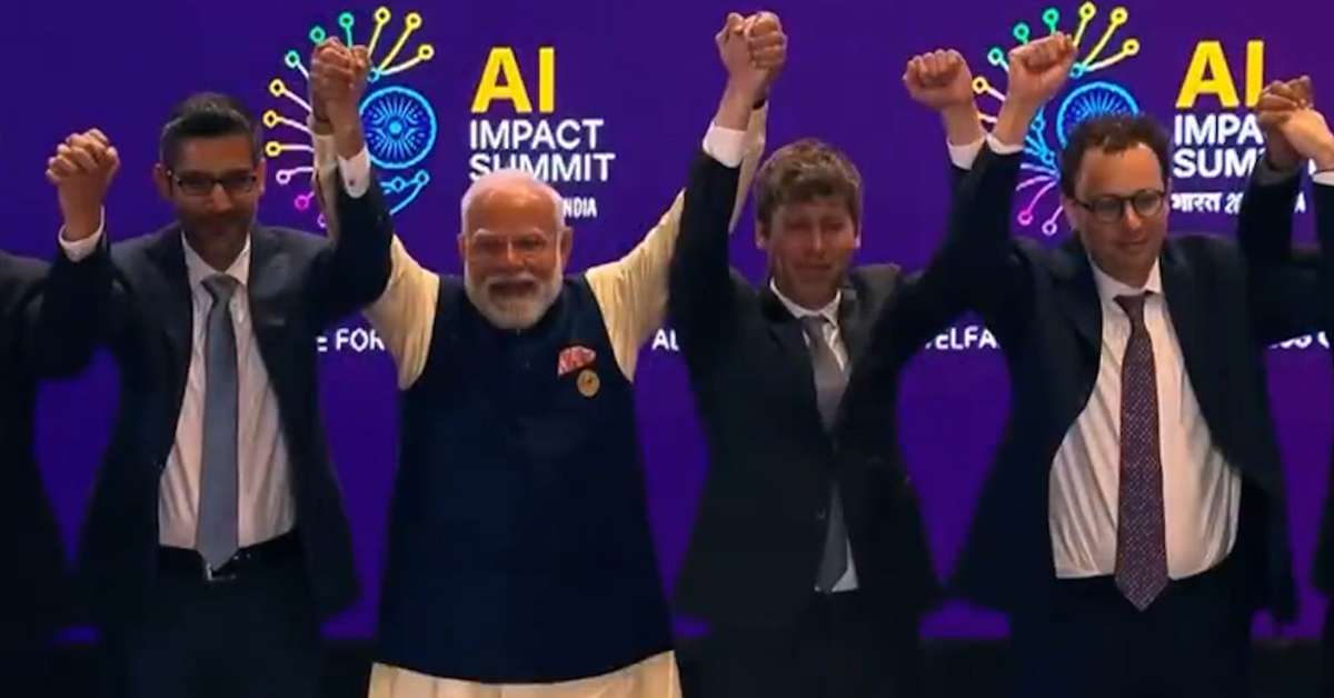 O momento aconteceu nesta quinta-feira, 19, durante a Cúpula de Impacto da IA, realizada na Índia. Sam Altman, CEO ad OpenAI (empresa dona do ChatGPT) e Dario Amodei, CEO da Anthropic (empresa responsável pela IA Claude) se recusaram a posar de mãos dadas. Ambos já trabalharam juntos; em 2021, Dario Amodei deixou a OpenAI para fundar a empresa concorrente, Antrophic, com foco em desenvolvimento de segurança da IA. Meses depois, Sam Altman e equipe lançaram o ChatGPT, segundo informações da Associated Press. Reprodução/narendramodi/Instagram