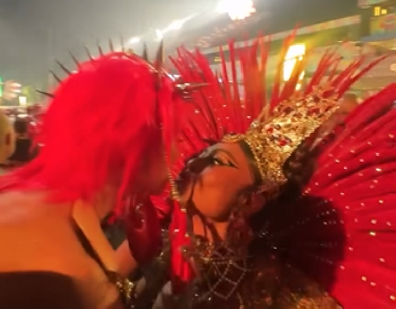 Juliana Paes, montada como rainha de bateria da Unidos do Viradouro, deu um selinho em Sabrina Sato, que acompanha como foliã a segunda noite de desfiles do Rio de Janeiro na madrugada desta terça-feira, 17. [LEIA MAIS]
