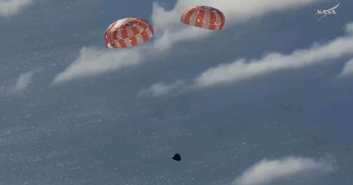 Uma das etapas mais críticas da missão, o pouso foi concluído na noite desta sexta, 10, na costa de San Diego, nos Estados Unidos. Dois kits de paraquedas foram liberados durante a operação para estabilizar a cápsula e reduzir a velocidade da queda para 32 km/h. Após o pouso, o capitão Reid Wiseman confirmou que todos os integrantes da missão passavam bem e aguardavam a operação de retirada. Crédito: Reprodução/YouTube/Nasa