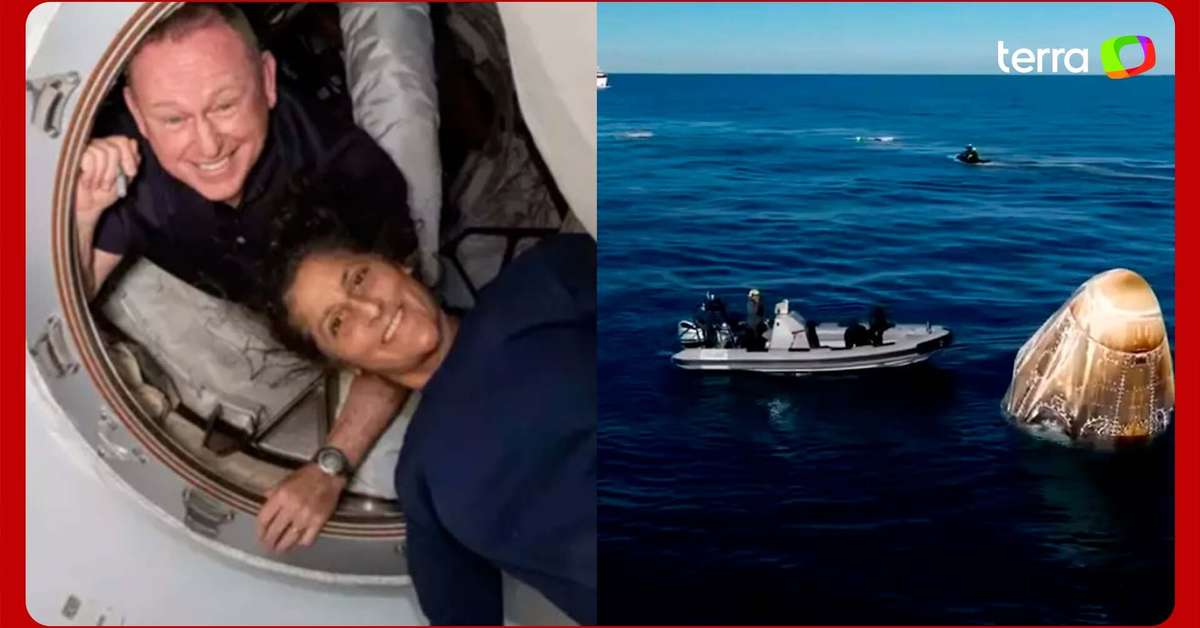 Os astronautas Butch Wilmore e Suni Williams retornam para a Terra nesta terça-feira, 18. Segundo a Nasa, a missão Crew-9, começou sua queima de saída de órbita às 18h11. A transmissão mostrou o momento da aterrissagem da cápsula na costa da Flórida. Os astronautas estavam presos no espaço desde junho de 2024. Reprodução/NASA/Youtube
