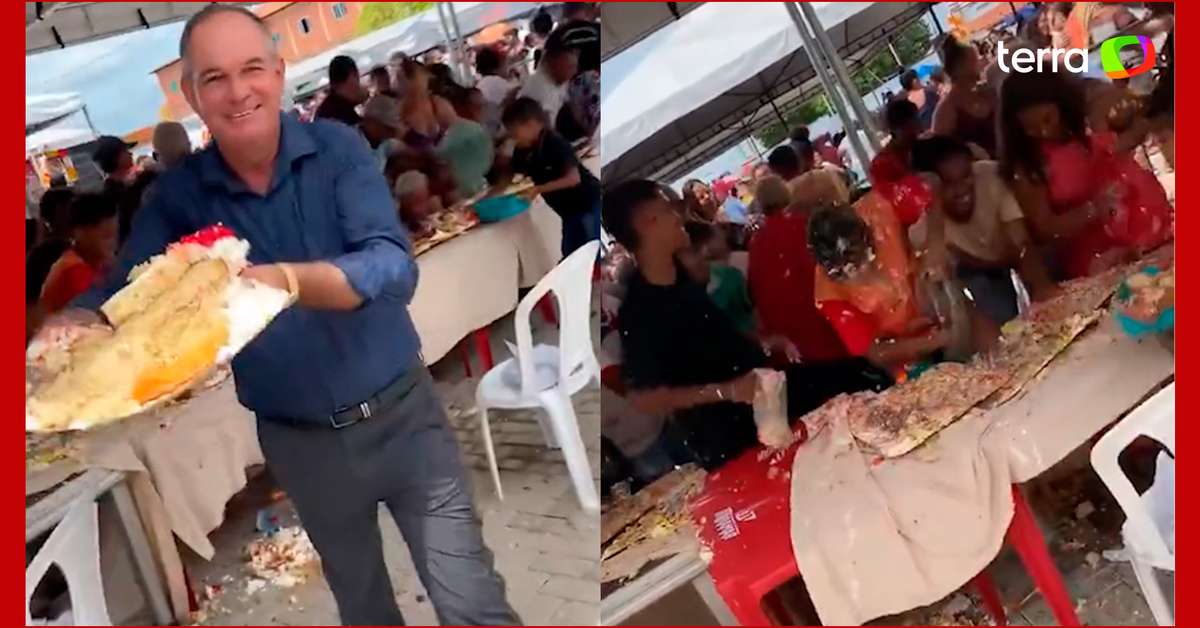 Bolo de 62 metros é 'destruído' em segundos por população de São Mateus do Maranhão. O objetivo da prefeitura era o de celebrar o aniversário de 62 anos do município, na terça-feira, 26. Um vídeo que circula nas redes sociais, porém, mostra uma confusão na distribuição do alimento à população. Nas imagens, os populares correm e tentam obter pedaços do bolo de todas as formas possíveis. A prefeitura de São Mateus do Maranhão não se pronunciou sobre as cenas registradas na ocasião.