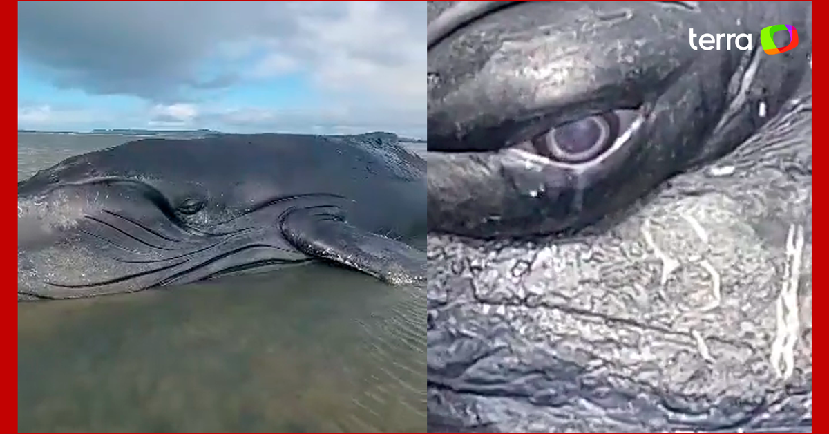 Baleia parece 'chorar' ao encalhar novamente em praia na Bahia. Registro do animal foi feito por moradores e viralizou neste domingo, 16. A baleia encalhou na praia do Caípe, em São Francisco do Conde, na região Metropolitana de Salvador. O animal é o mesmo que já havia encalhado na Baía de Todos-os-Santos, na semana passada. Apesar de parecer estar chorando, o olho lacrimejando é resultado de uma glândula que evita o ressecamento do local.