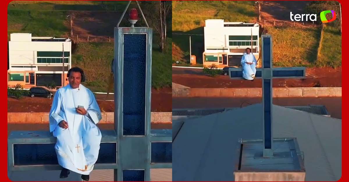 A cena que viralizou nas redes sociais nesta quinta-feira, 15, foi registrada em Apucarana, no norte do Paraná. O padre Laércio José de Lara subiu na cruz de uma igreja usando um equipamento de segurança e fez o convite sentado no topo da estrutura. Nas redes, internautas ficaram impressionados com a coragem de Laércio e a criatividade da paróquia para divulgar a Festa de Santo Expedito. Para finalizar, ele deu sua bênção aos fiéis ali do alto mesmo, com a cidade ao fundo. Reprodução/pnsaigrejinha/Instagram