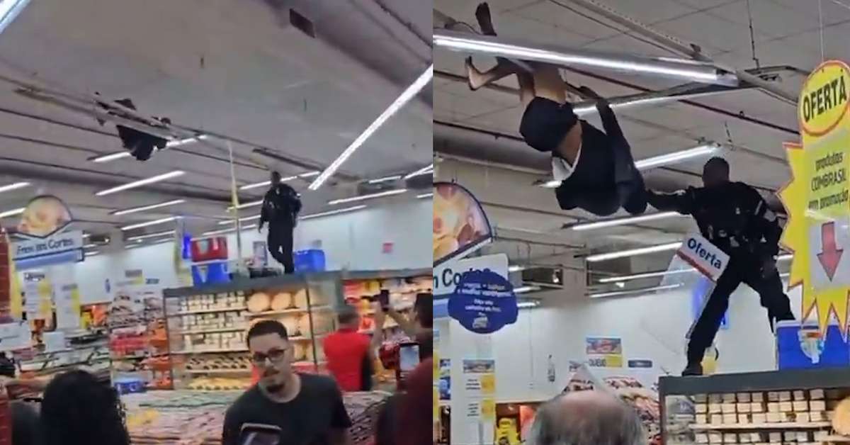 PM sobe em prateleira e retira homem pendurado no teto de supermercado no RJ. A cena, que circula nas redes sociais, chamou a atenção de clientes que estavam na tarde de sábado, 26, no Guanabara da Penha, na zona norte do Rio. Na gravação, é possível observar a aglomeração de pessoas que se formou para acompanhar a ação; relatos indicam que a PM foi acionada após o homem subir no local. Após alguns instantes, o agente consegue puxar e retirar o homem, que estava agarrado a uma estrutura no teto do estabelecimento; ele foi imobilizado. A Polícia Militar do Rio de Janeiro informou ao Terra, por meio de nota, que os agentes foram acionados para conter o homem "que estava danificando mercadorias e ameaçando clientes" no estabelecimento. "O agente o resgatou com objetivo de preservar sua integridade física e acionou o Samu", acrescentou a corporação. Reprodução/tininhasouzarj/X Reprodução/InformeRJO/X