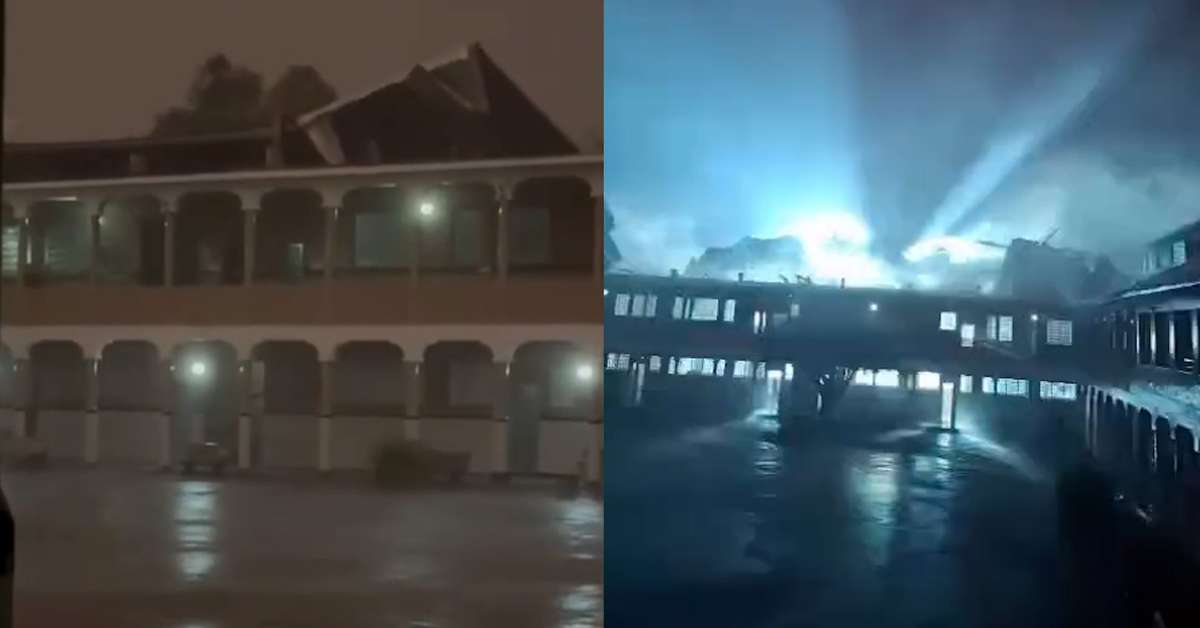 A forte chuva atingiu a cidade de Aimorés na última terça-feira, 25, e causou transtornos no centro da cidade. Em vídeos que circulam nas redes, é possível ver uma explosão e as telhas do prédio voando. Reprodução/Mundo em Fatos/Facebook Reprodução/@bbbrezenski/Facebook