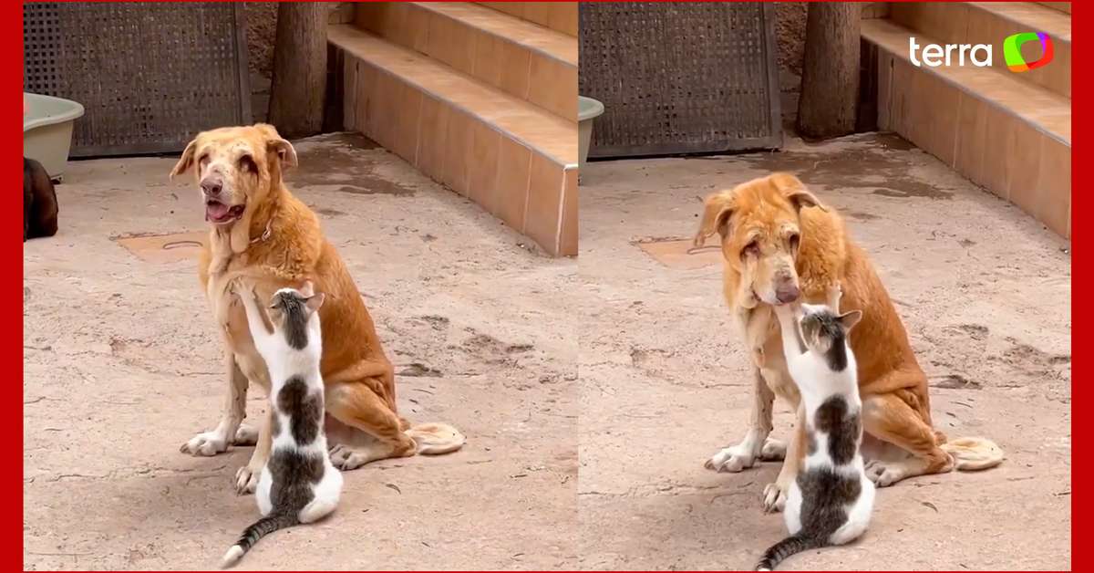 Gato de abrigo faz ‘massagem’ carinhosa em cão idoso e cego. Momento ocorreu entre animais resgatados em abrigo no Marrocos. O cão chamado Tam, de 9 anos, tem uma doença degenerativa que afeta suas articulações. Os ‘amigos felinos’ expressam afeto com massagens e o cão não se incomoda. Segundo página do abrigo, a cena comovente acontece com frequência entre os animais.
