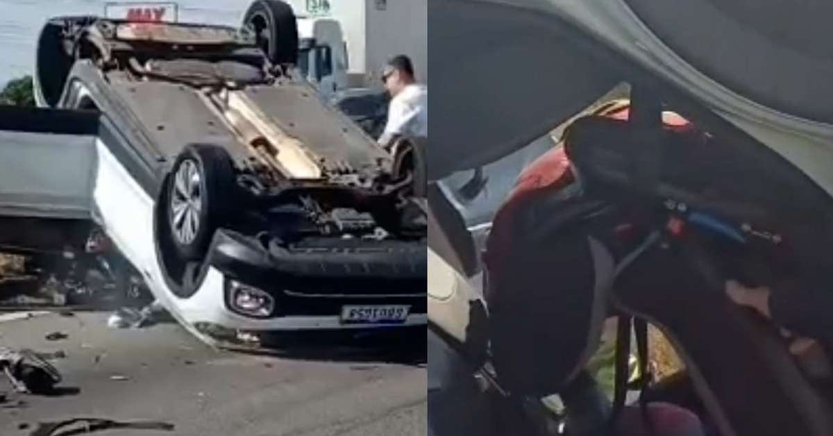 O acidente ocorreu no sábado, 20, na Rodovia Presidente Dutra, sentido Rio de Janeiro. Uma colisão traseira seguida de capotamento interditou totalmente a pista próximo à Refinaria Henrique Lage. Três pessoas ficaram feridas, entre elas uma criança e uma mulher grávida; elas receberam atendimento no local. Segundo a PRF, a cadeirinha infantil foi decisiva para a sobrevivência da criança envolvida no acidente. Créditos: @myhoodbr (ig) | @prf_sp (ig)