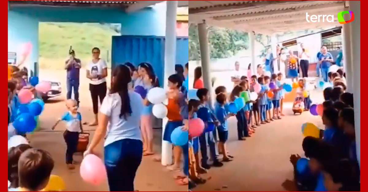 Garotinho é recebido com homenagem emocionante em escola após vencer o câncer. O retorno às aulas da criança aconteceu com uma grande comemoração após passar por um tratamento contra o câncer. Em vídeo que circula nas redes sociais, o menino caminha por um corredor formado por seus amigos. As crianças seguram balões coloridos e alguns professores aplaudem durante a entrada. Nos comentários, os internautas se emocionaram com atitude e alegria do pequeno. Veja vídeo.