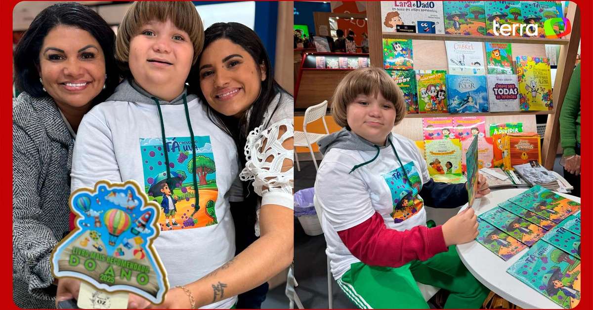 Vittorio Apps, de 10 anos, viajou à Itália para lançar seu sétimo livro, Tá Chovendo Uva. O lançamento ocorreu na Feira do Livro Infantil de Bolonha, na terça-feira, 1º. A história fala sobre uma cidade surpreendida por uma chuva de uvas. O livro é uma homenagem à tia do autor, que também é autista e tem síndrome de Down e microcefalia. Vittorio já recebeu prêmios internacionais por sua produção literária. Imagem: Arquivo pessoal