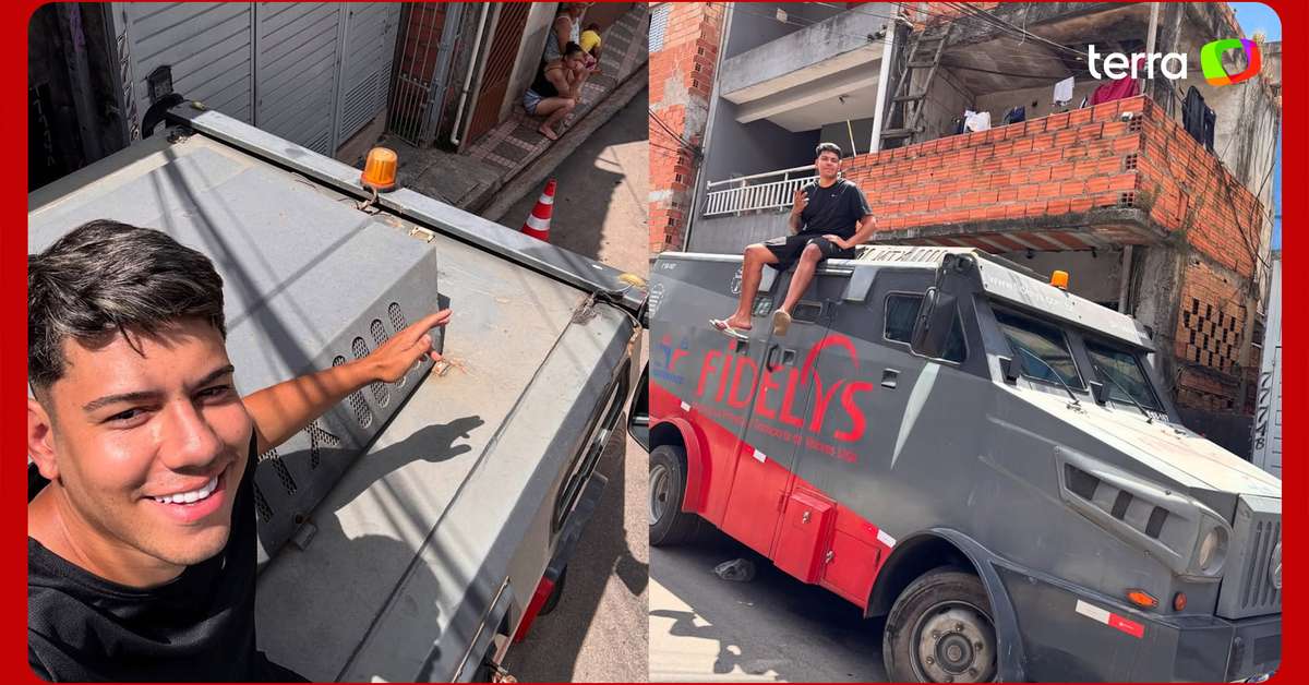 Vinicius Carvalho está viralizando nas redes ao mostrar sua nova aquisição. Ele arrematou um carro-forte em um leilão no último mês e mostra seu cotidiano com o veículo. Nos vídeos, ele até mostra o interior do carro e passa em um "Drive-Thru de churrasquinho". A circulação do veículo, no entanto, já rendeu um enquadro por parte de policiais. Por lei, apenas empresas cadastradas e com fins de transporte de bens podem utilizar o veículo. Reprodução/_ocarrochefe/Instagram