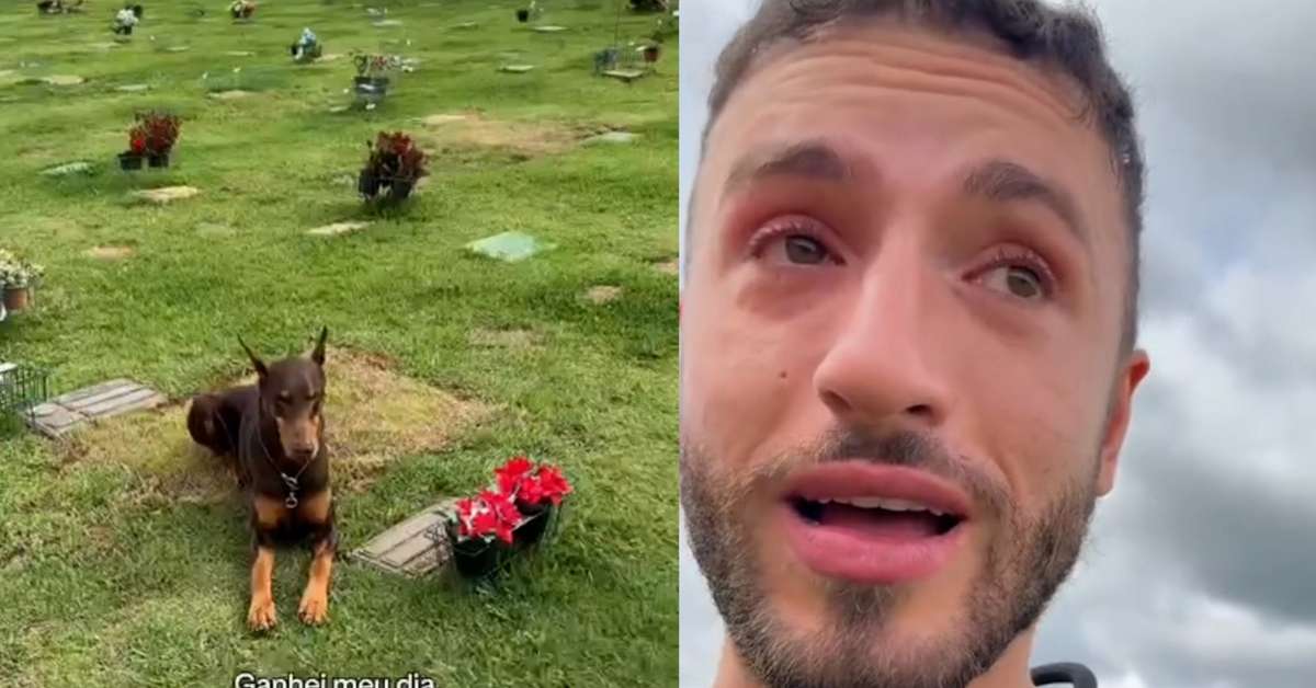 O registro foi feito por Gabriel Di Garcia durante uma visita a um cemitério e viralizou nas redes sociais. Nas imagens divulgadas, o cachorro chamado Nero caminha pelo local e vai direto ao túmulo do avô do tutor. “Ele simplesmente deitou e ficou aqui”, disse Gabriel, emocionado. Reprodução/@Gabriel.digarcia/Instagram/MyHood