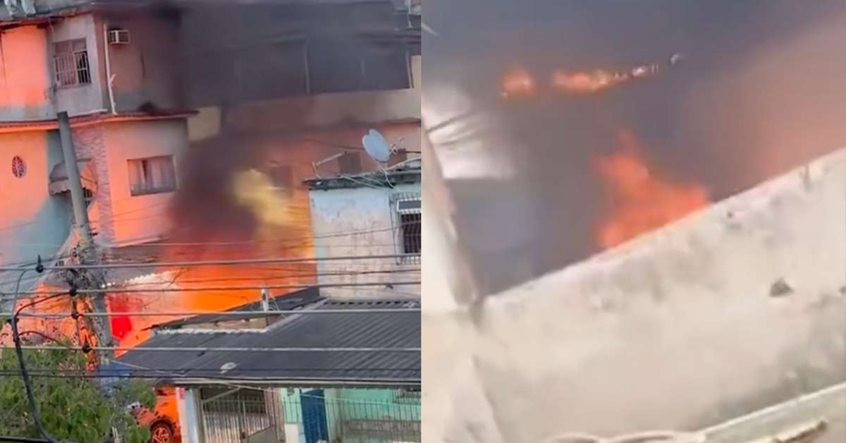 Nas imagens, é possível ouvir fortes estrondos, semelhantes a pipocos, vindo dos imóveis. Em outro ângulo, uma mulher grita desesperadamente por ajuda devido às chamas. A operação aconteceu nesta terça-feira, 28, nos complexos do Alemão e da Penha. Mais de 60 suspeitos foram mortos e cerca de 81 foram presos. Reprodução/@raphael.ph22/ myhoodbr Reprodução/@s1lva_.021/myhoodbr