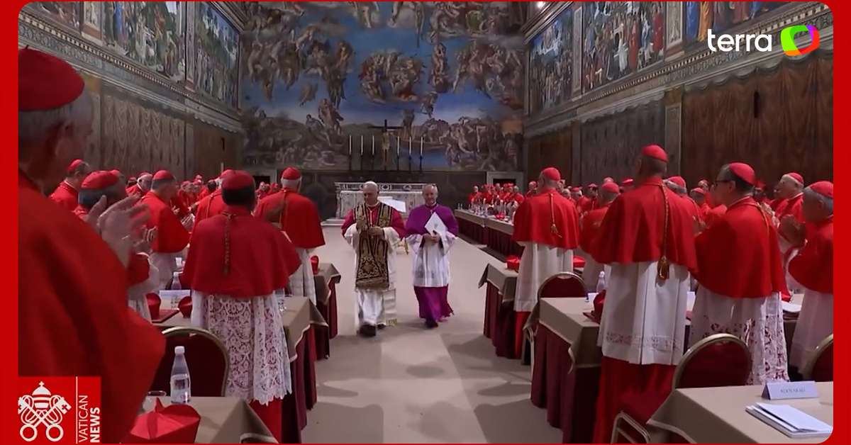 O Vaticano divulgou nesta quinta-feira, 8, o momento em que papa Leão XIV é recebido pelos cardeais e aplaudido na Capela Sistina. O norte-americano Robert Prevost, de 69 anos, foi escolhido como o 267º pontífice da Igreja Católica. Nas imagens, ele é visto com as vestes papais enquanto caminha pela Capela e, sem seguida, faz orações. Robert Prevost é o primeiro papa dos Estados Unidos e prometeu continuar legado de paz de Francisco. Reprodução/Vatican News