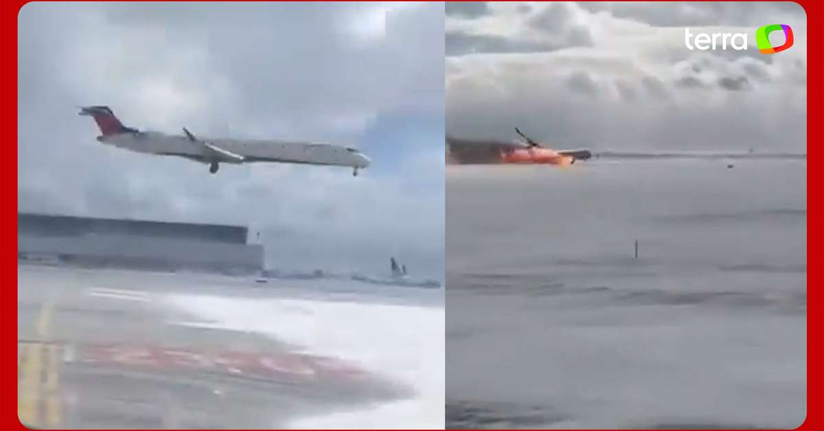 Vídeo mostra o momento em que avião capota ao aterrissar em Toronto, no Canadá. As novas imagens revelam como foi o acidente, que ocorreu na segunda-feira, 17. Na gravação, a aeronave pega fogo logo após tocar a pista e vira de ponta-cabeça. As chamas do avião, modelo Mitsubishi CRJ-900LR, foram contidas na sequência. O voo, que partiu da Minneapolis (EUA), tinha 80 pessoas a bordo; 18 ficaram feridas. Destas, três tiveram ferimentos graves, incluindo uma criança; o acidente é investigado. Reprodução/airplusnews/X
