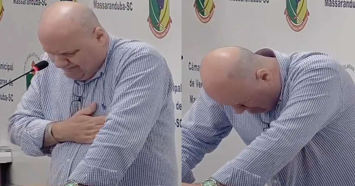Vereador passa mal e desaba durante discurso em Santa Catarina. A cena foi registrada na Câmara Municipal de Massaranduba na segunda-feira, 4; José Osnir Ronchi (PP) chegou a colocar a mão no peito antes de cair no chão. Apesar do susto, o político recebeu alta nesta terça-feira, 5, após ser levado para um hospital; o vereador afirmou que teve um pico de pressão arterial na ocasião. Reprodução/Câmara de Vereadores de Massaranduba - SC/Youtube