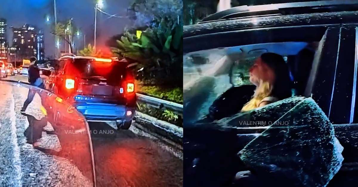 O ataque violento foi registrado por um influenciador chamado “Valentim” e publicado nas redes sociais na quinta-feira, 26; de acordo com ele, por volta das 19h, a vítima foi cercada. Em segundos, os criminosos quebraram os dois vidros do veículo, levaram o celular da vítima e fugiram em seguida; o motociclista buzinou para tentar impedir o crime. “Depois do assalto, permaneci com a moça, tentando dar apoio e segurança até o marido dela chegar. Cena triste, revoltante e que mostra como ninguém está livre”, relatou. Reprodução/@valentim_o_anjo
