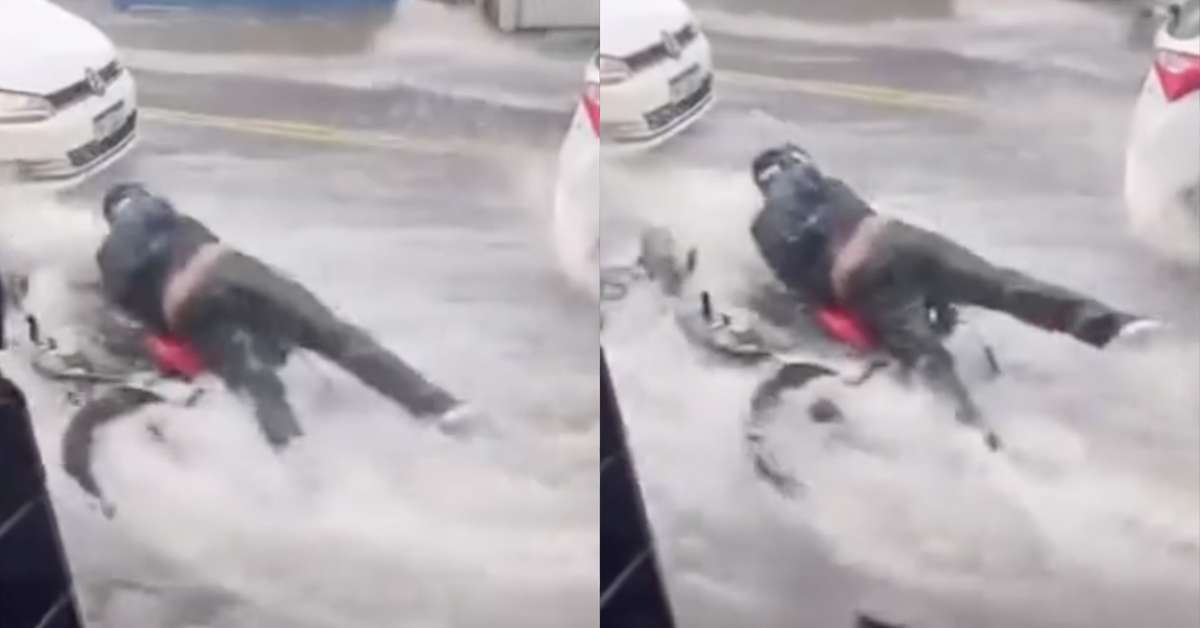 Nas imagens, é possível ouvir testemunhas se desesperando com a situação, que ocorreu nesta sexta-feira, 16, no Parque das Nações. Apesar do susto, de acordo com informações da página “Viva ABC”, o motociclista conseguiu se levantar e não se feriu. Este é o 3º dia consecutivo em que são registradas chuvas intensas na capital paulista e na Região Metropolitana. Reprodução/@vivaabc_/Instagram