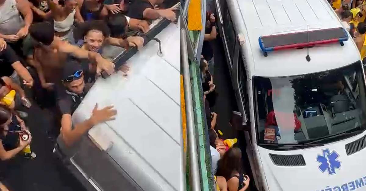 Imagens registradas por foliões mostram o momento em que o veículo tenta avançar em meio ao público, no domingo, 8. Em determinado momento, alguns deles chegam a se pendurar na parte traseira da ambulância enquanto ela tenta avançar lentamente.