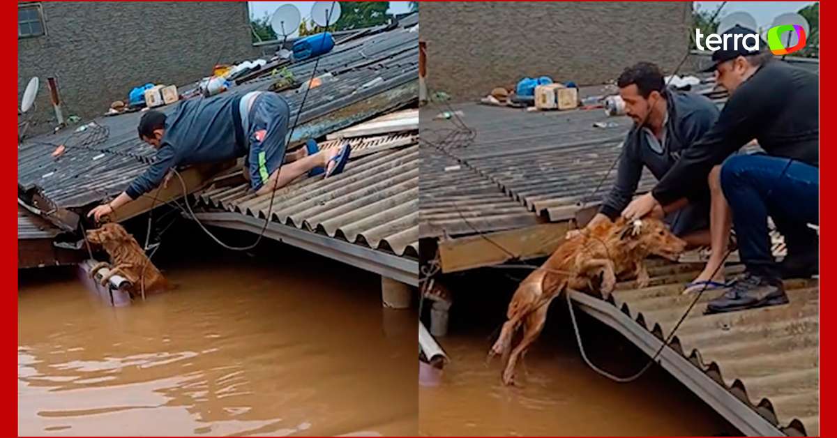 Cachorro caramelo é resgatado após segurar em muro de casa alagada do RS. No vídeo, um cão aparece agarrado à estrutura de uma casa em meio à enchente. Dois voluntários conseguiram chegar até o animal, e puxá-lo para o telhado. Na sequência, o cãozinho aparece a salvo no barco com os dois homens que o salvaram. O registro emocionou os internautas e já conta com mais de 700 mil visualizações.