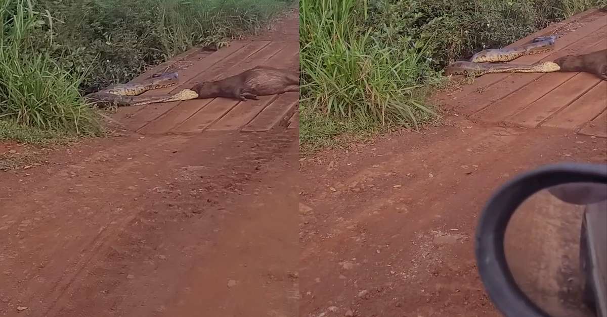 Vídeo mostra sucuri tentando devorar capivara em MS. O registro foi feito por César Bertoldo na última quinta-feira, 23, às margens de um córrego na Fazenda Refúgio, a cerca de 20 quilômetros de Sidrolândia. Ao perceber o que ocorre, o homem para o veículo e passa a gravar a serpente, que tenta levar o animal morto para debaixo de uma ponte de madeira. “Será que a bicha é monstra, que trem mais bonito”, diz ele ao gravar a cena e ficar impactado pelo tamanho da sucuri. #terranoticias Reprodução/César Bertoldo/Facebook