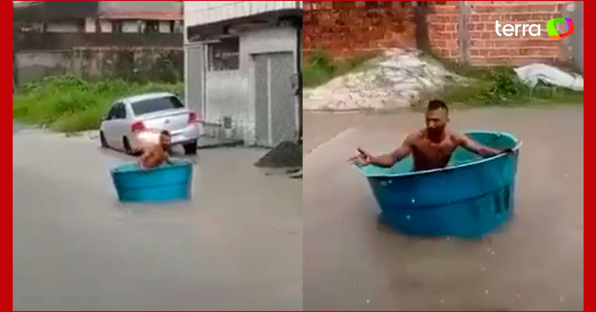 Homem é flagrado usando caixa d'água como barco em rua alagada na Bahia. A cena foi registrada nesta terça-feira, 5, em Dias d'Ávila, cidade da Região Metropolitana de Salvador. O homem aproveita para cobrar as autoridades diante da situação: "E os vereadores? Cadê?", diz.