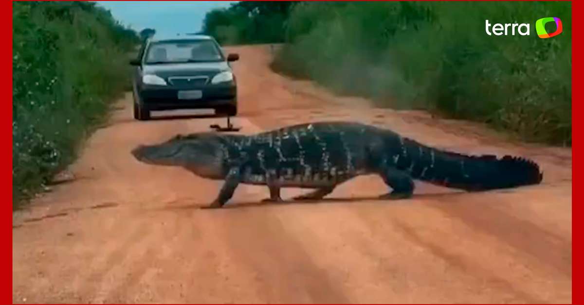 Jacaré 'gigante' surge atravessando estrada no Tocantins. Cena foi registrada na última quinta-feira (22), em Formoso do Araguaia, região norte do Estado. De dentro do carro, o motorista que capturou o momento se impressiona com o tamanho do animal. "Olha o tamanho do rapaz. Será que é grande?”, comenta. O jacaré-açu, exclusivo da América do Sul, é a maior espécie e pode chegar a 6 metros, de acordo com o IBAMA. Veja vídeo.
