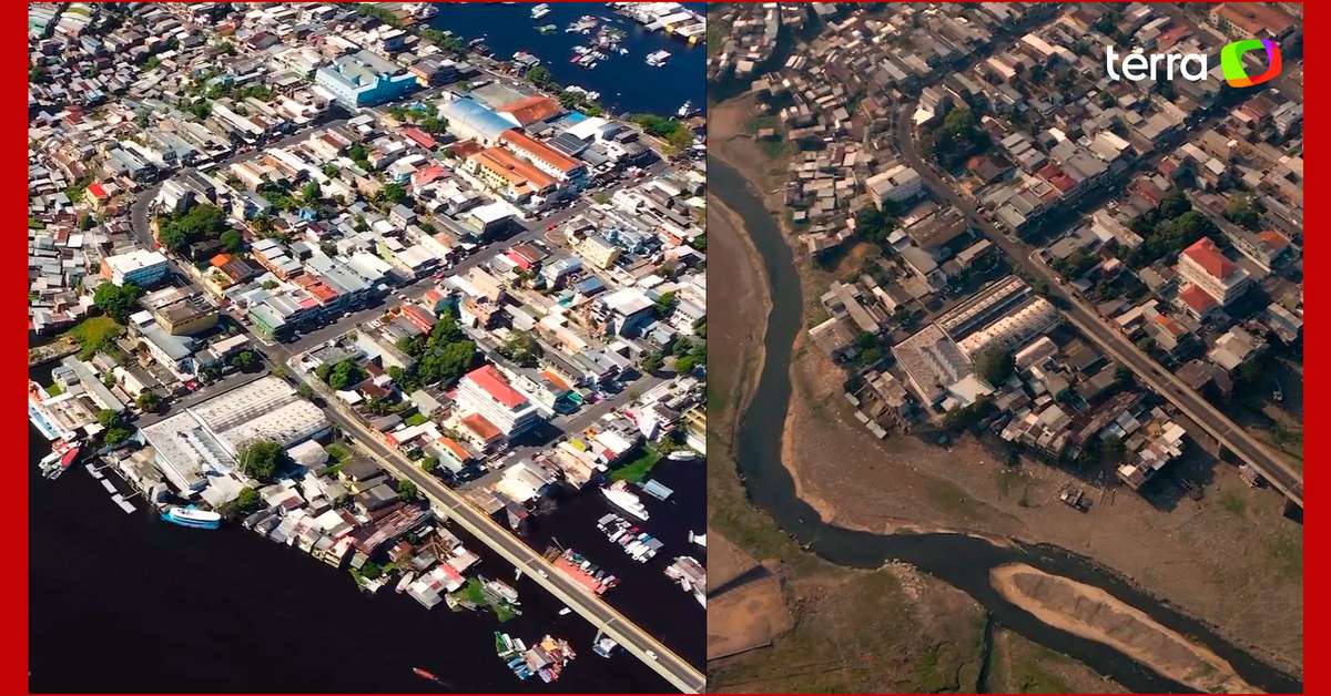 Imagens de drone mostram antes e depois da seca no Amazonas. Os registros de Thiago Oliver mostram a transformação na orla de Manaus com a estiagem. Nas imagens, o Rio Negro aparece no período de cheia e, agora, com a seca na região. Segundo o monitoramento do Porto de Manaus, a seca deste ano é a pior já registrada. O rio de 1.700 km de extensão alcançou 13,59 metros, ultrapassando o número de 2010. Segundo o Porto de Manaus, as águas continuam baixando cerca de 13 centímetros por dia. Na publicação, que teve grande repercussão, internautas lamentaram a situação. "Parece filme apocalíptico", escreveu um deles ao comentar a severa crise ambiental.