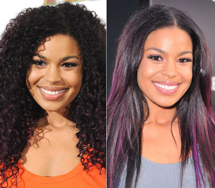 Em maio deste ano, a cantora norte-americana foi vista com dois looks totalmente diferentes. Primeiro, Jordin surgiu com os cabelos tingidos de borgonha e todo cacheado. Dias depois, ela esteve em uma pré-estreia usando fios lisos e mechas em variados tons de roxo. Qual look combinou mais com ela?