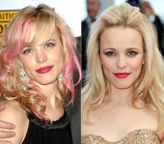 Em 2007, a atriz, que é naturalmente morena, compareceu a uma pré-estreia com o cabelo loiro com mechas cor-de-rosa. Este ano, durante o Festival de Cinema de Cannes, que aconteceu em maio na França, Rachel foi vista com fios lisos e loiros. Qual look é mais bacana?