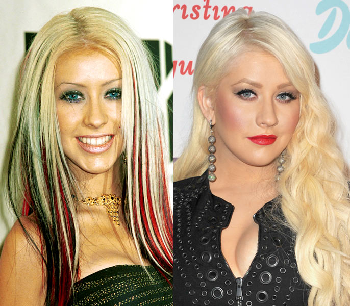 Em 2000, a cantora desfilava com fios lisos e coloridos apenas nas pontas, nas cores preta e rosa. Atualmente, Christina adotou os fios platinados e ondulados. Qual look você prefere?