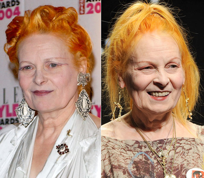 A estilista inglesa sempre divulgou que é fã do movimento punk e curte um rock’n roll. Há anos, ela usa os cabelos pintados de laranja, variando apenas a tonalidade, que aparece mais forte, como em 2004, e mais suave, atualmente. Qual tom você prefere?