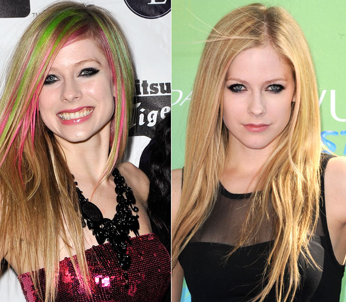 Em abril deste ano, a cantora canadense foi vista circulando com mechas verdes e cor-de-rosa em seus cabelos loiros. Quatro meses depois, Avril abandonou os fios coloridos e retomou a coloração loira. Como ela ficou mais bonita?