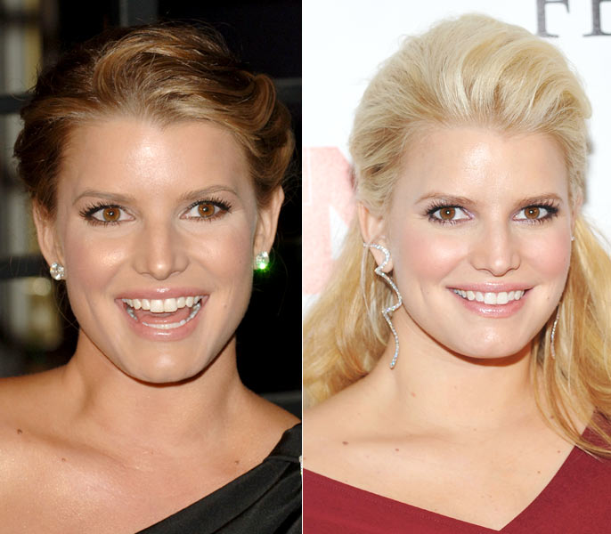 Com pescoço curto, Jessica Simpson já usou tanto brincos pequenos, combinado aos fios presos, quanto o pendente de strass, com comprimento até metade do pescoço e meio-rabo. Qual você acha que ficou melhor?