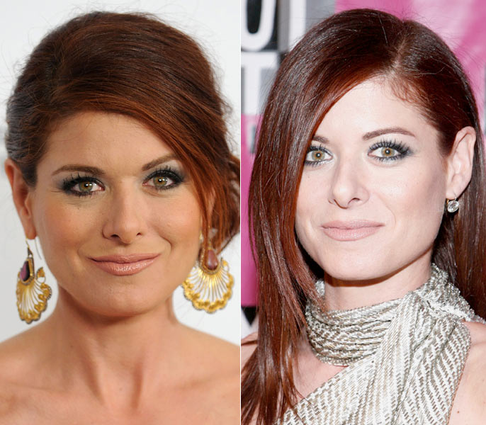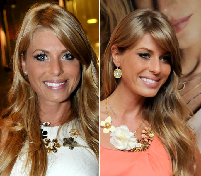 O mesmo make, apenas penteados e brincos diferentes. À esquerda, Debra prendeu os fios e, por estar usando um vestido que deixava o colo nu, a atriz usou um brinco médio e dourado, que ressaltou a cor de seus olhos. À direita, com fios soltos e vestido amarrado no pescoço, ela escolheu um brinco pequeno. Qual você prefere?