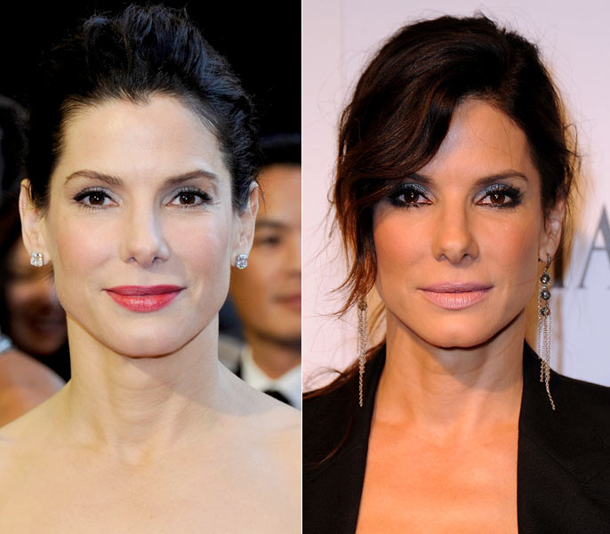 Quando prendeu os cabelos e usou batom vermelho, Sandra Bullock escolheu um brinco pequeno, de pedra transparente, para completar seu look. Em outra festa, ainda com os cabelos presos, mas com fios soltos, a atriz caprichou no make dos olhos, combinando com um brinco grande e com pedras negras. Qual combinação mais te agradou?