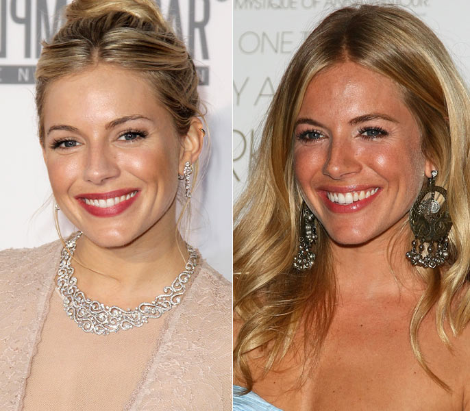 A atriz britânica combinou os fios presos com um batom vermelho discreto e o conjunto de brincos médios e gargantilha com muito brilho para uma festa. Em outro evento, Sienna deixou os fios soltos, usou make discreto e longos brincos de ouro velho com o vestido tomara-que-caia. Qual combinação foi mais impactante?