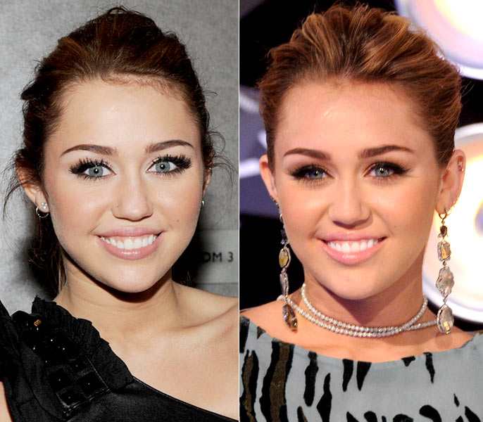 Com o mesmo make, de olhos marcados e boca nude, e cabelos presos, Miley Cyrus mudou apenas o traje e os acessórios. À esquerda, com vestido preto de um ombro só, ela usou um brinco prateado bem pequeno, enquanto à direita, com vestido fechado e estampado, ela combinou um colar de pedras brilhantes com um longo brinco de pedras. Qual look ficou mais bacana?